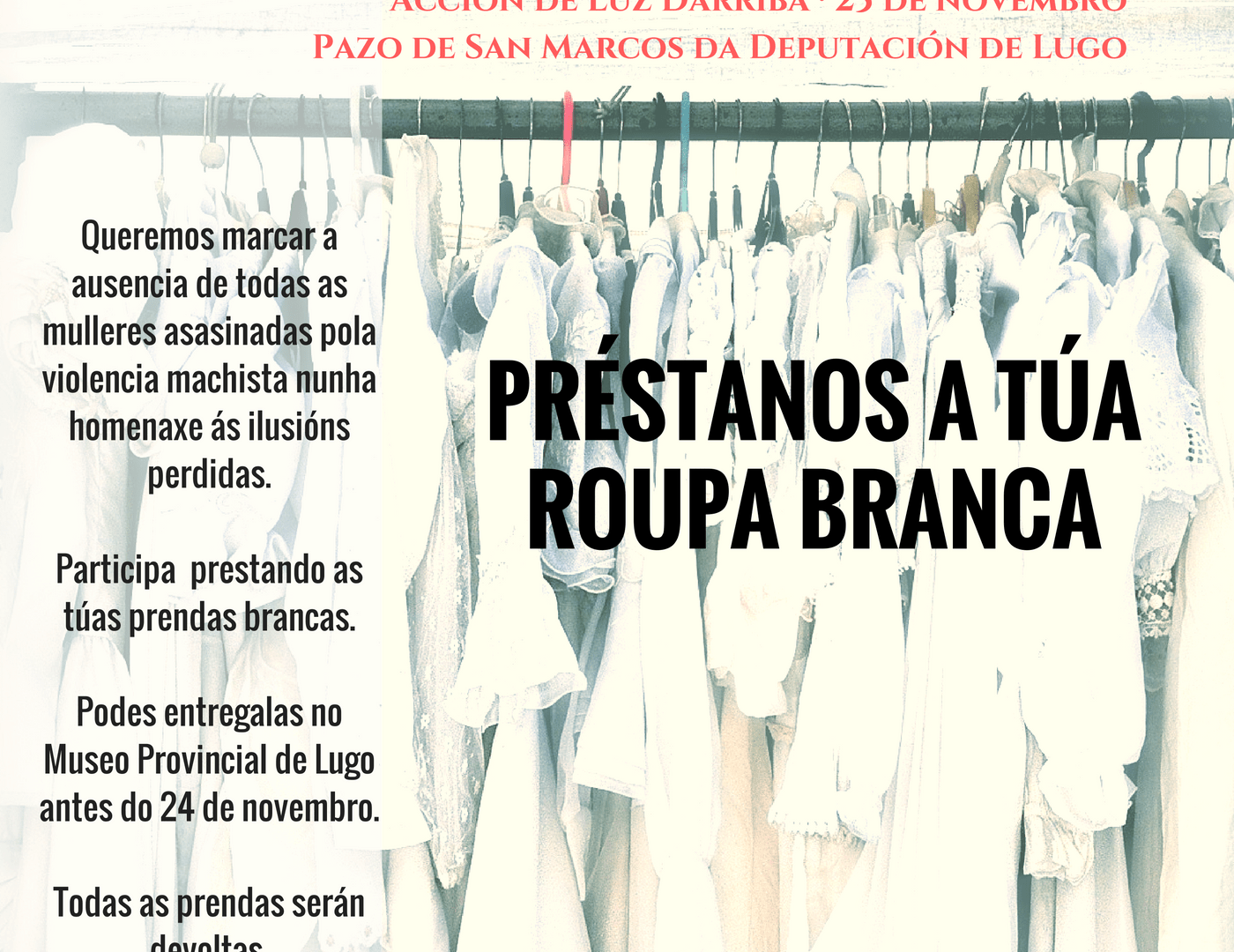 O raio que non cesa é unha acción de Luz Darriba sobre a fachada da Deputación de Lugo para o Día contra a Violencia de Xénero, dentro da programación da Rede Museística Provincial. 40 prendas brancas en homenaxe ás 40 mulleres asasinadas pola violencia de xénero (na conta do 24 de novembro).